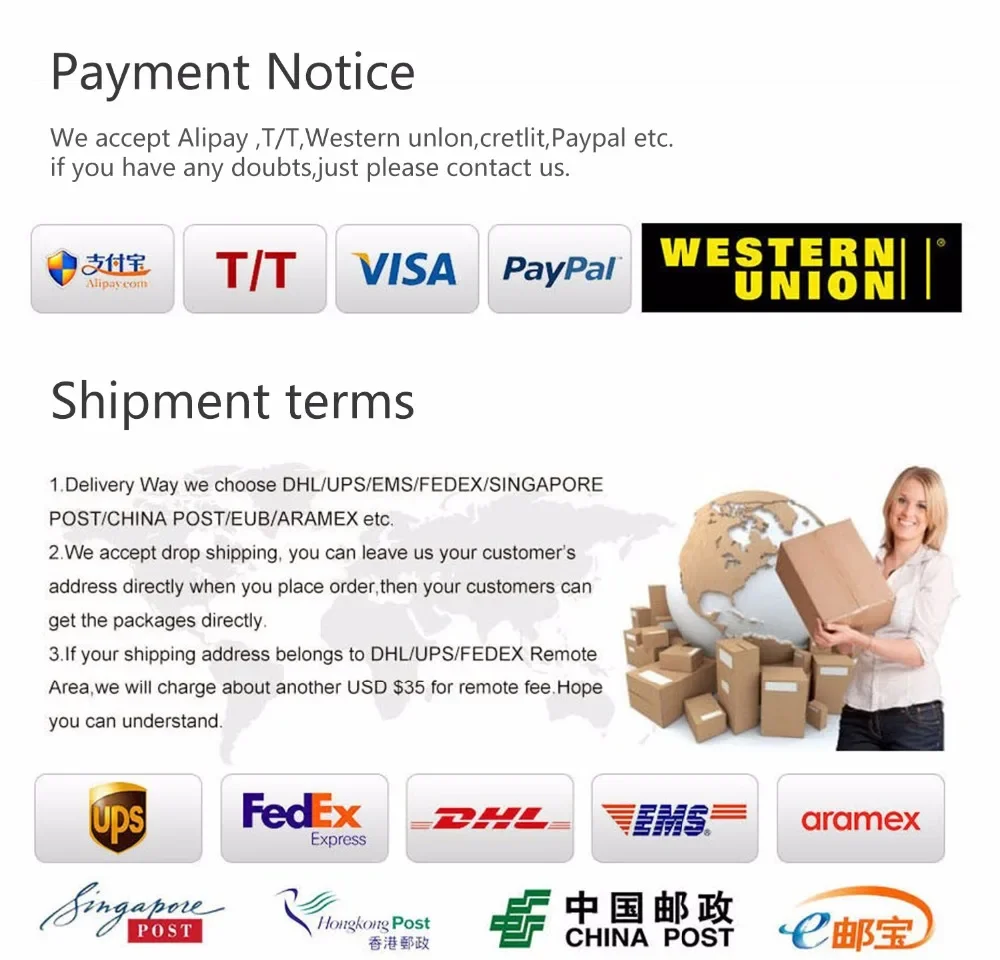 Мы Един наш costomers запишите видео или фотографировать перед открыванием посылки. это доказательства ipportant в случае посылки были прибыли поврежденные. Если ваш город представляет собой в удаленном эреме, клиентов учатся к bossable дополнительной зарядке DHL или другую доступной логистике. мы готова, чтобы помочь наших клиентов для решения любых проблем продуктов, они встречи и неисправности после полученного, provide лучший способ ручки и рассмотрите в наших клиентов.